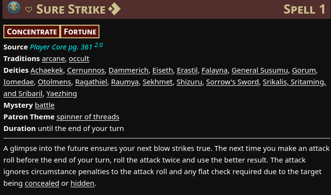 The most recent example of this came alongside some newly published errata from Paizo concerning a spell called Sure Strike. Previously this spell was called True Strike before Paizo undertook a lengthy process to “remaster” the game and scrub any trace of OGL D&D-isms from the game. It was considered a pretty powerful spell, allowing the caster to spend one action casting it to get advantage on their next attack roll, alongside ignoring concealment and other similar debuffs. The combination of it only requiring one action in PF2E’s three action economy, alongside it being a level one spell, meant a lot of the optimization side of the community thought it was pretty essential on any caster that might also be in melee.