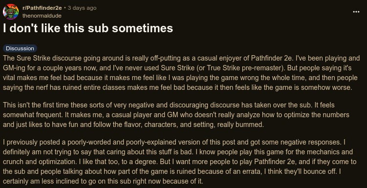 These types of discussion easily take up over 50% of the subreddit at any given time, and produce a sort of “poisoning the well” effect where the community just appears hostile to a newcomer. The PF2E community seems very focused around build optimization and playing the game RAW (Rules as Written). And while that is not, inherently, a bad or invalid way to approach a tabletop RPG, pretending it is the only way to play is invalidating to other people who may not share that view or have different goals for their table.